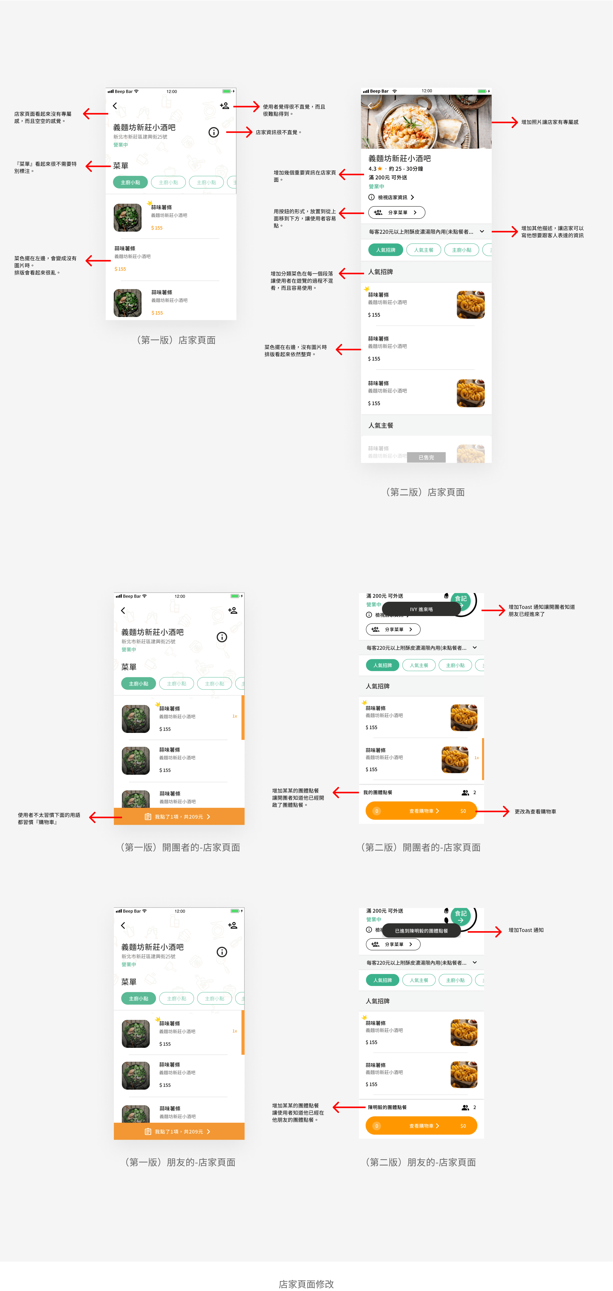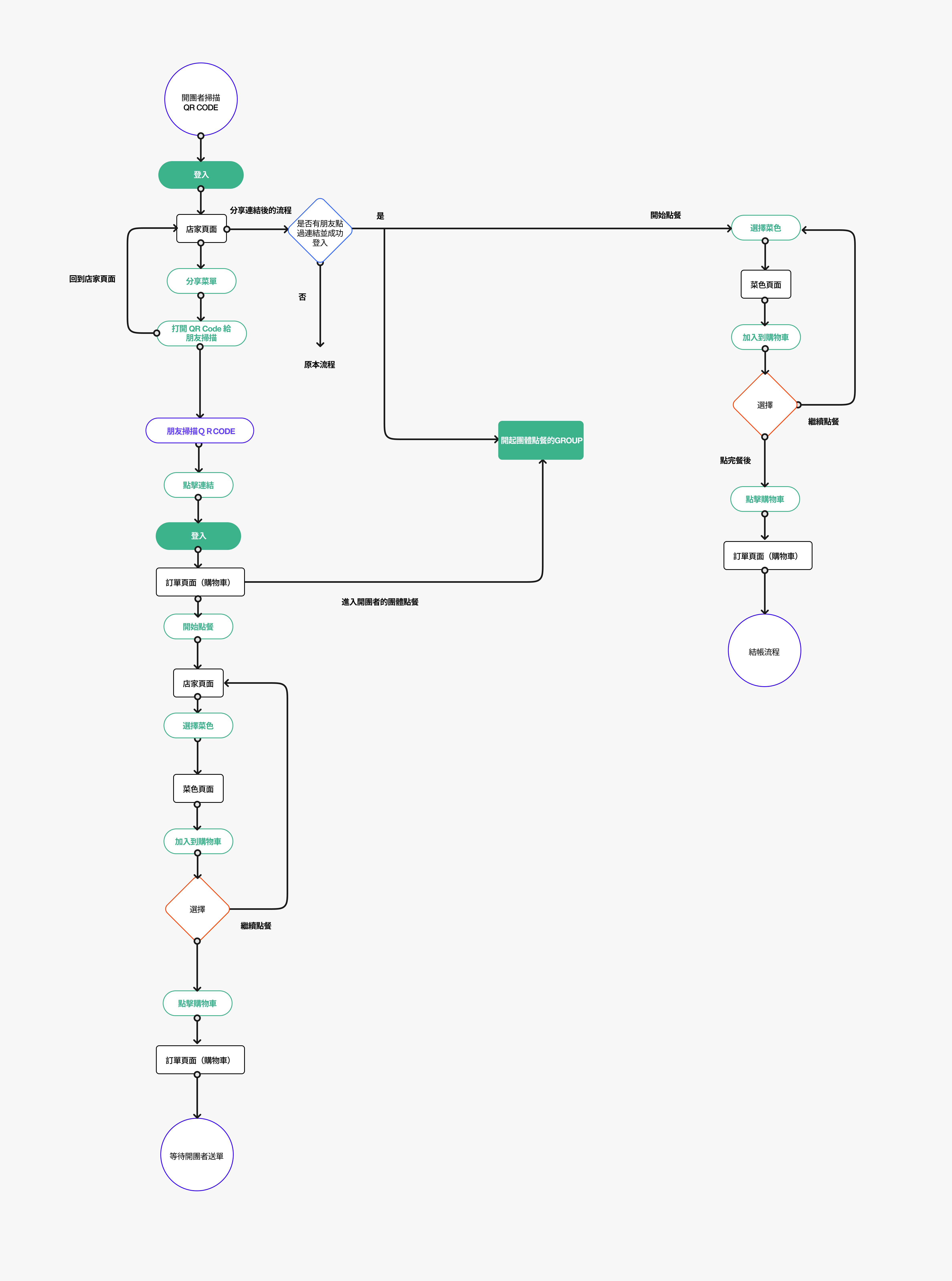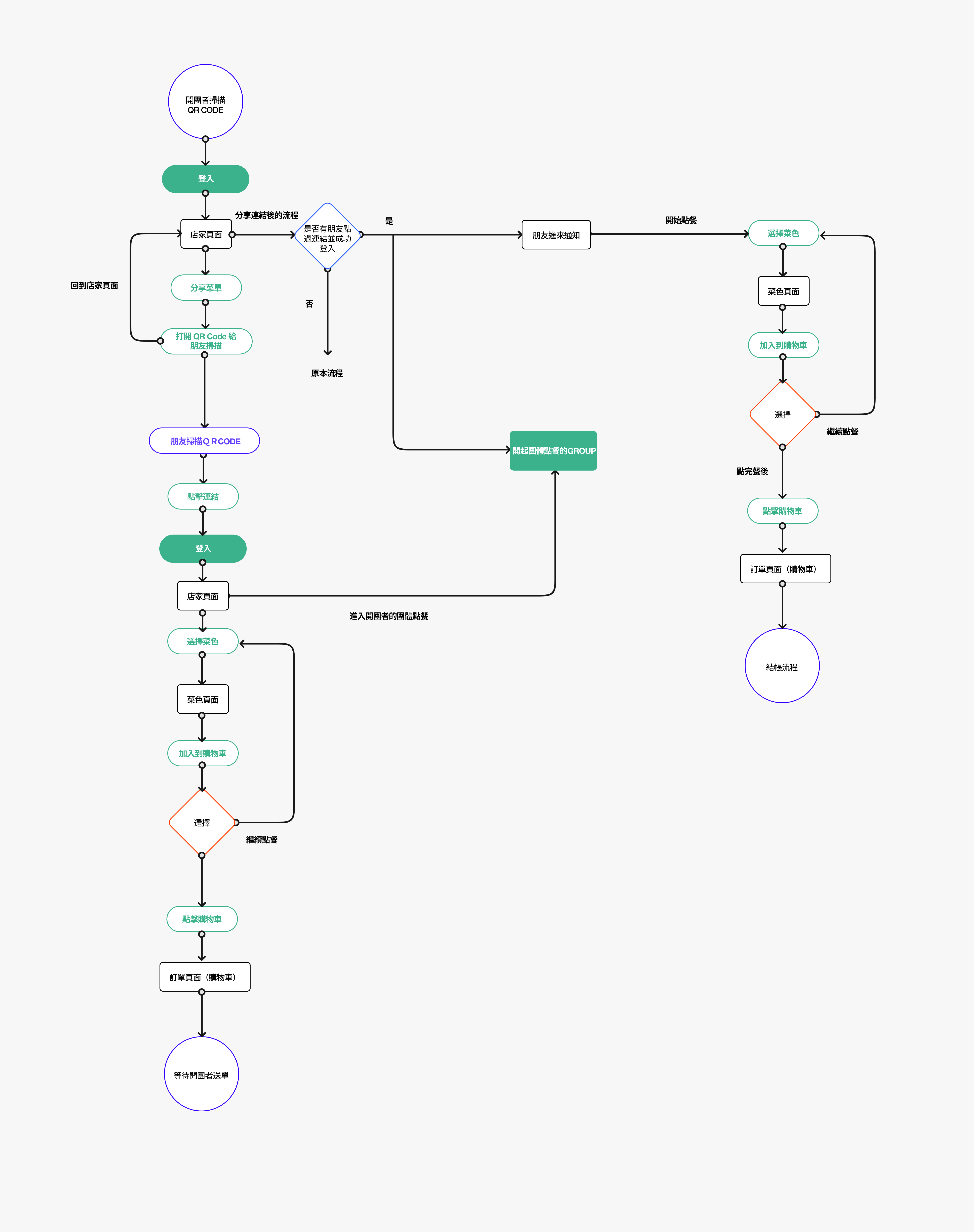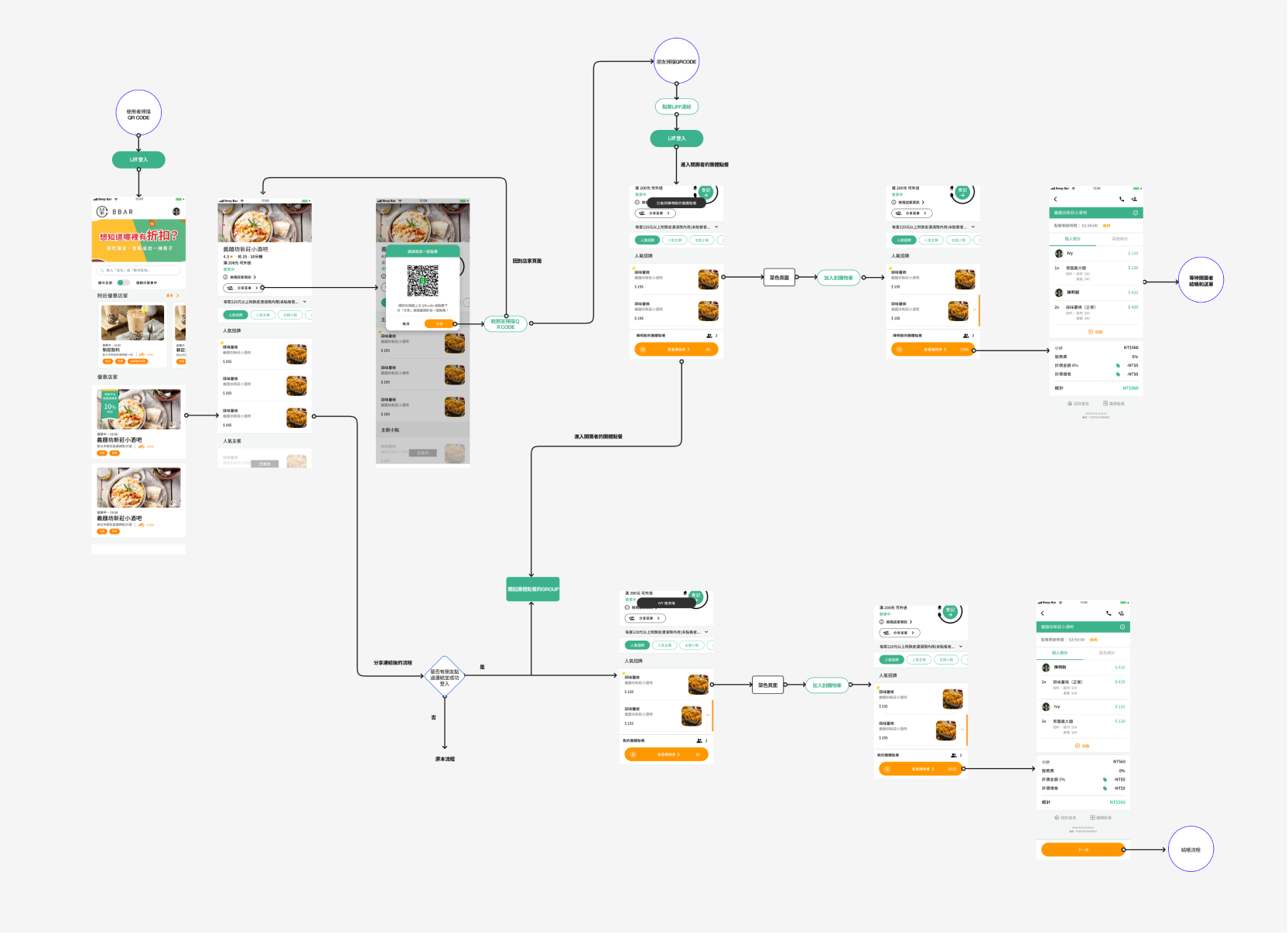除了重新設計UI,我們會希望提升點餐的體驗,於是在討論中有提到怎麼讓開團者和其他人可以一起進行點餐。我的想法是開團者在分享連結給他朋友之後,只要朋友點進連結和登入, 開團者的訂單就會自動開啟“團體點餐的訂單”。 這訂單裏面會紀錄開團者和他朋友的餐點。