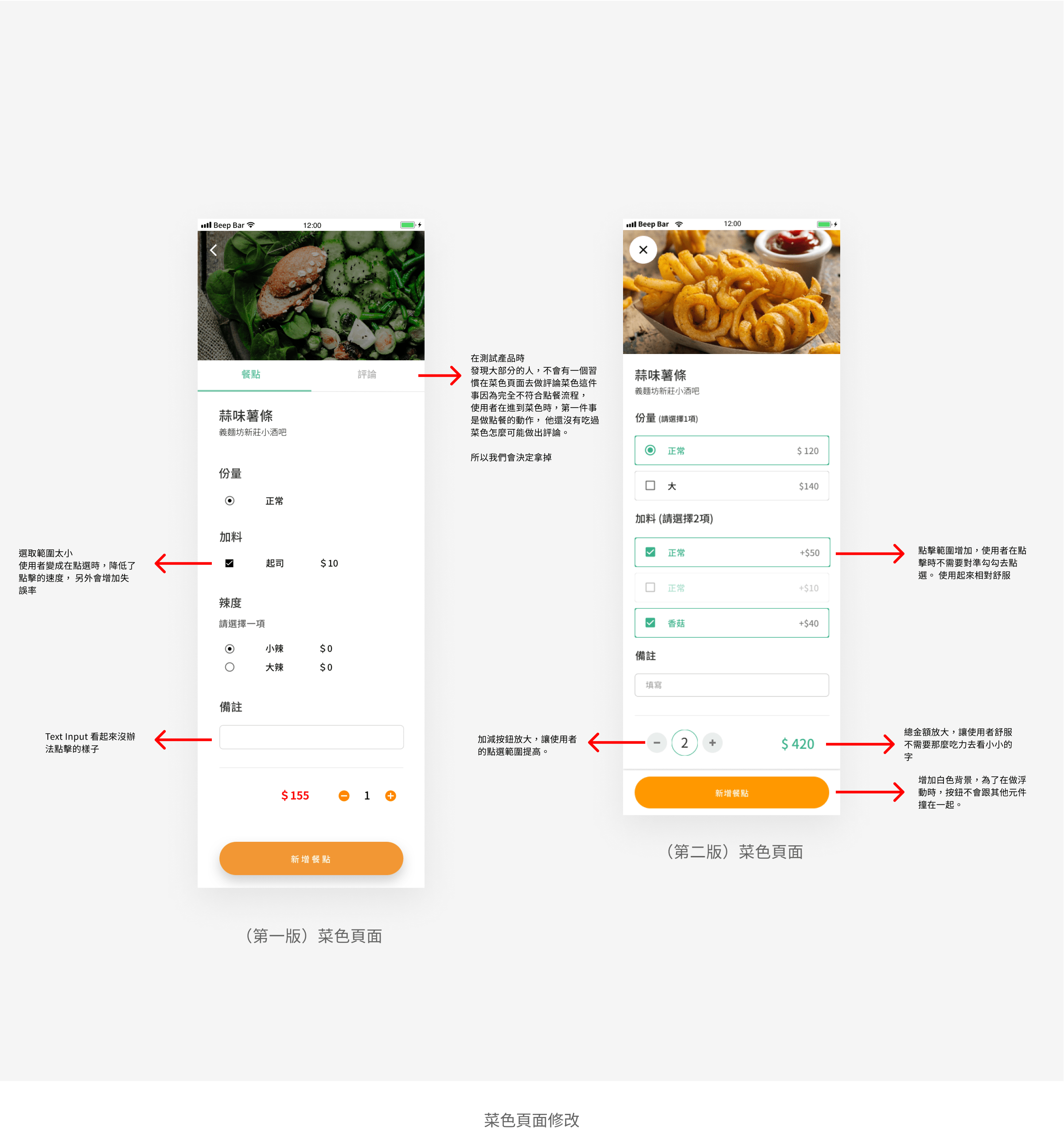 3. 觀察發現,他們在點菜色的份量,辣度,加料時很小心翼翼,我認爲使用者點選時,就是要對準radio button框框或是勾勾, 使他們的點擊範圍很小,降低了點擊的效率,白話說就是沒辦法大膽,輕鬆地點選。