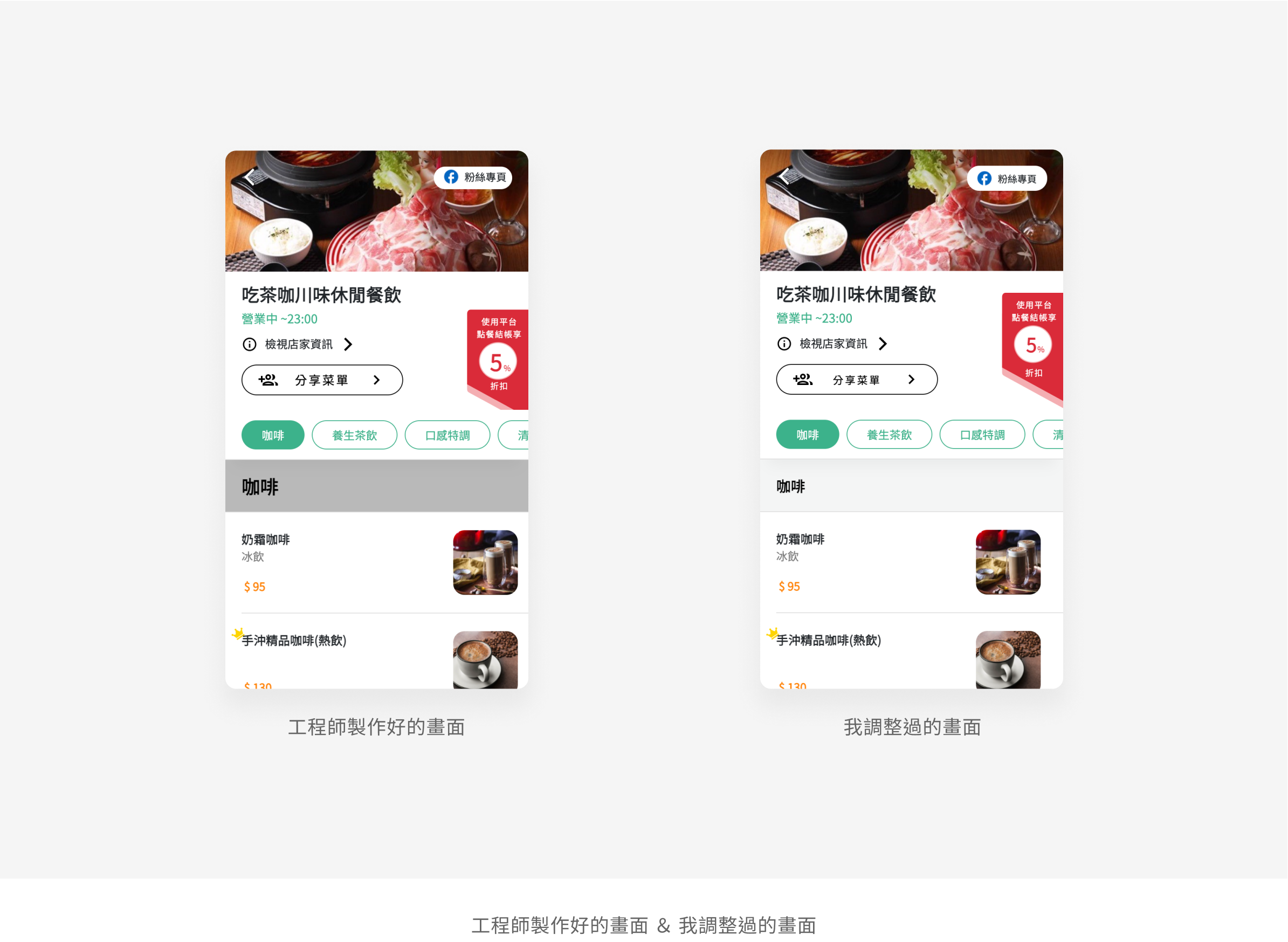 在工程師的討論中,有討論到將菜色頁面改成單獨的modal畫面,因為它只是點選菜色的輔助頁面,如果他是獨立頁面的話會導致使用者在返回時會一直遇到菜色頁面。