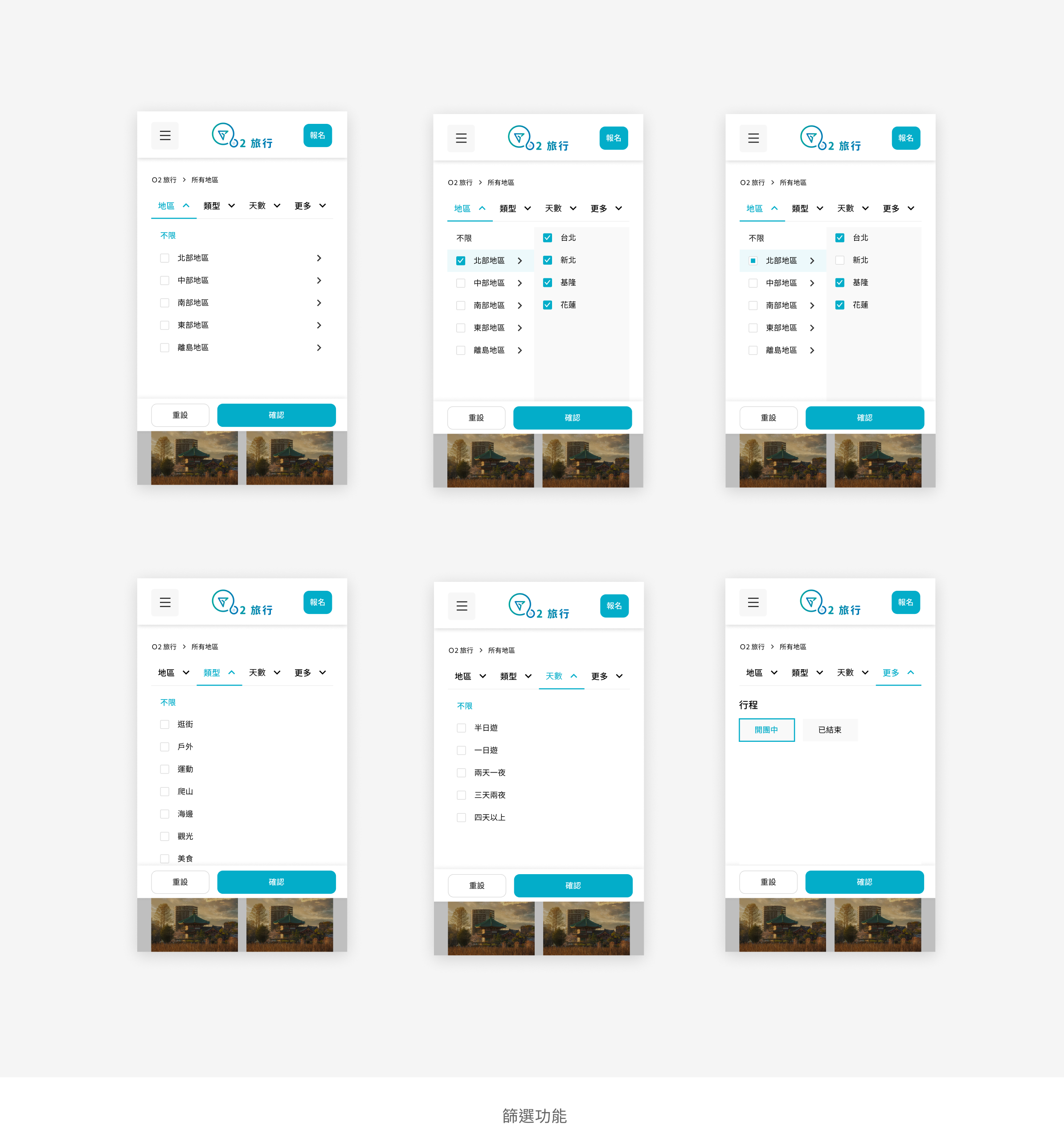 針對以上幾個問題我設計了篩選機制, “不限”為正常狀態,只要打勾縣市,區域就會全打勾,取消一個區域,縣市狀態從勾勾會變成一個藍色方塊,意思是還在選擇中但是不是全部勾選。